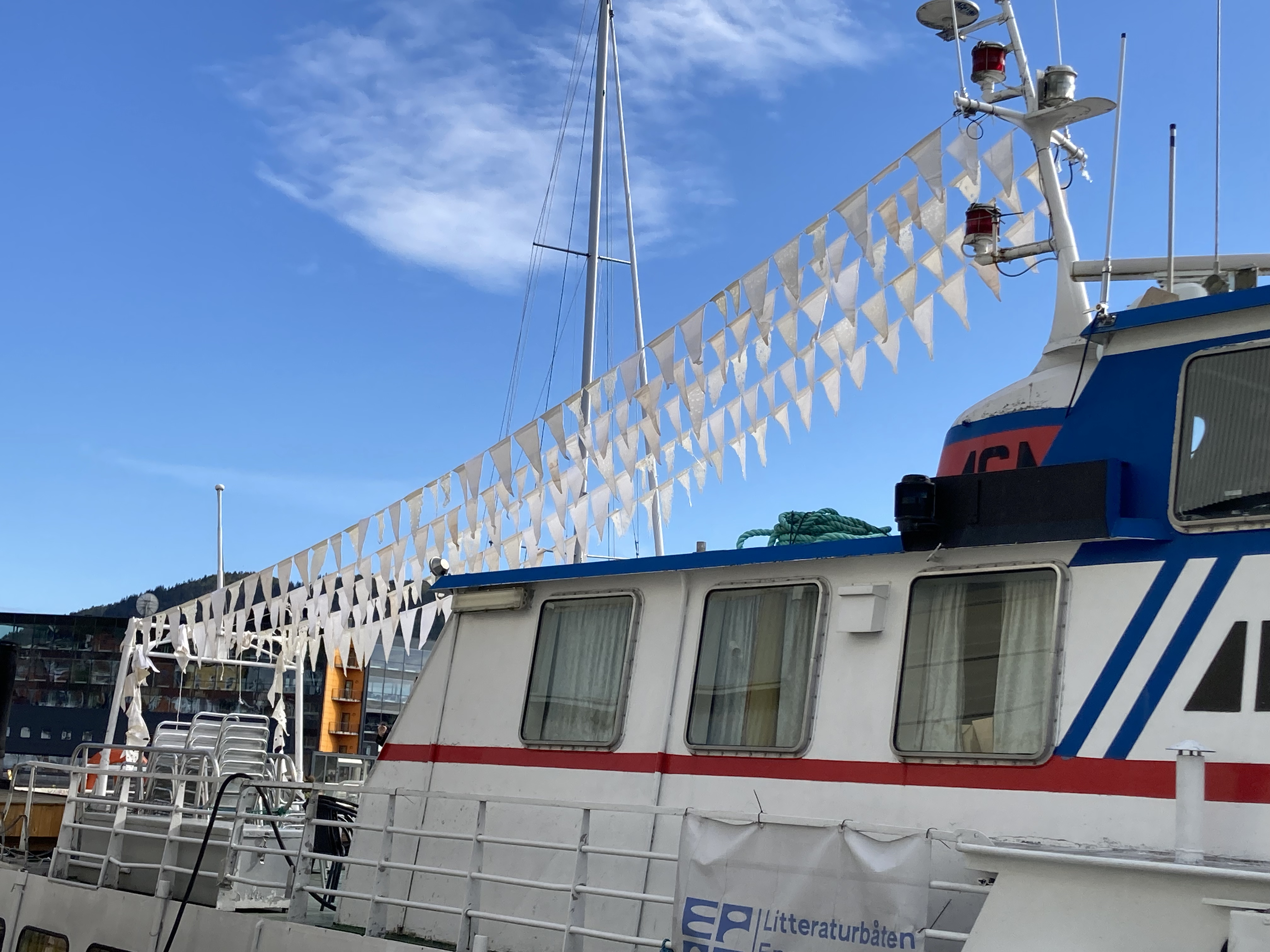 Created for across, with, nearby, Elsebet Rahlff’s new work draws from the language of maritime signalling to create a space of quiet attention and reflection. 300 white pennants shown on the Literature Boat Epos in collaboration with the wind, rain, sunlight, and sea. Suspended across the aft deck within multiple overhead flag cords are white triangular pennants, made from recycled fabrics and treated with caustic soda for strength and durability. Varying in their construction — perforated, layered, or simply cut — the flags form a dynamic mass in motion, activated by even the slightest breeze at sea.