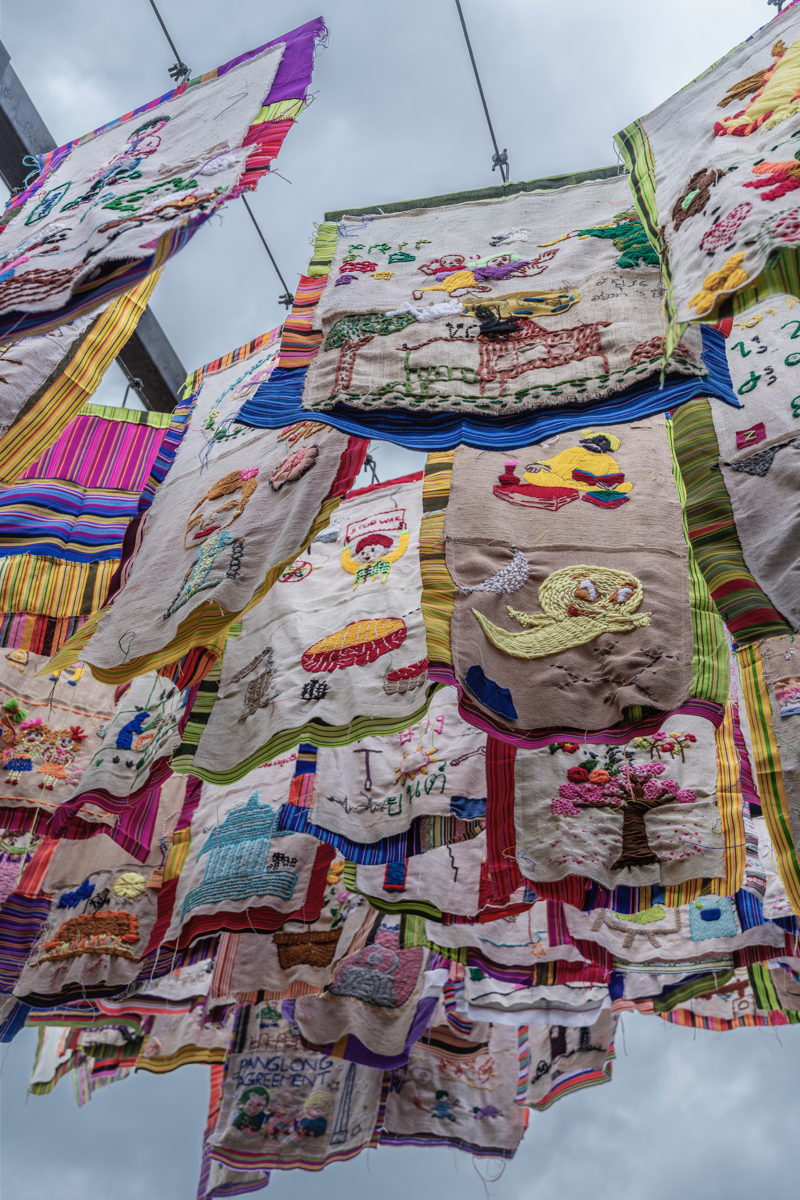 Jakkai Siributr’s project began at a refugee camp at a border between Thailand and Myanmar where people from stateless Shan communities were invited to share their life experiences through embroidery. The multi-coloured scenes show a spectrum of experiences and personal stories from daily life; traumas, hopes, memories, idealisations of safety, children, soldiers, and landscapes are all depicted.