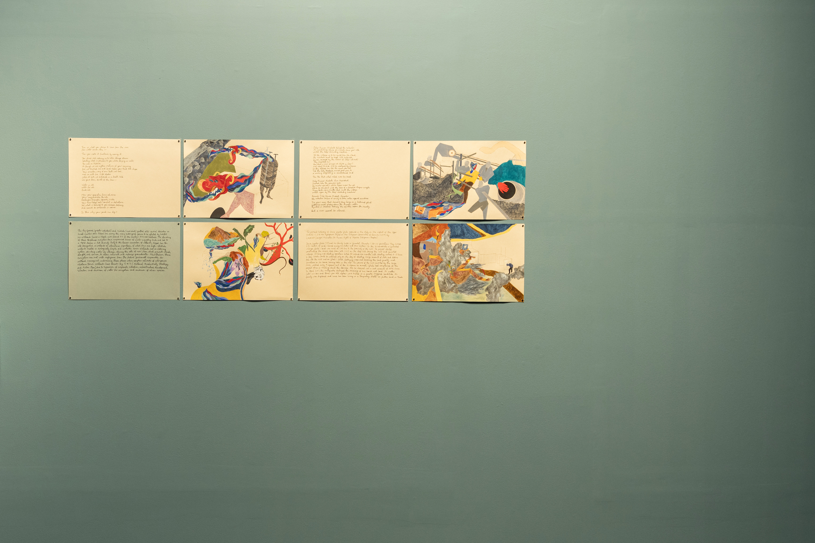 Shrestha’s expansive, ongoing work adapts this traditional form to hold together contemporary words and images. The project gathers essays, report excerpts, poetry, oral myths, and individual testimonies to narrate the state of water in 21st-century Nepal. Through his collection and collage of these materials, Shrestha reveals the deep entanglement of issues including climate change, state negligence, caste-based violence, infectious disease, flora and fauna, and the shrinking of wetlands through damming and extraction.