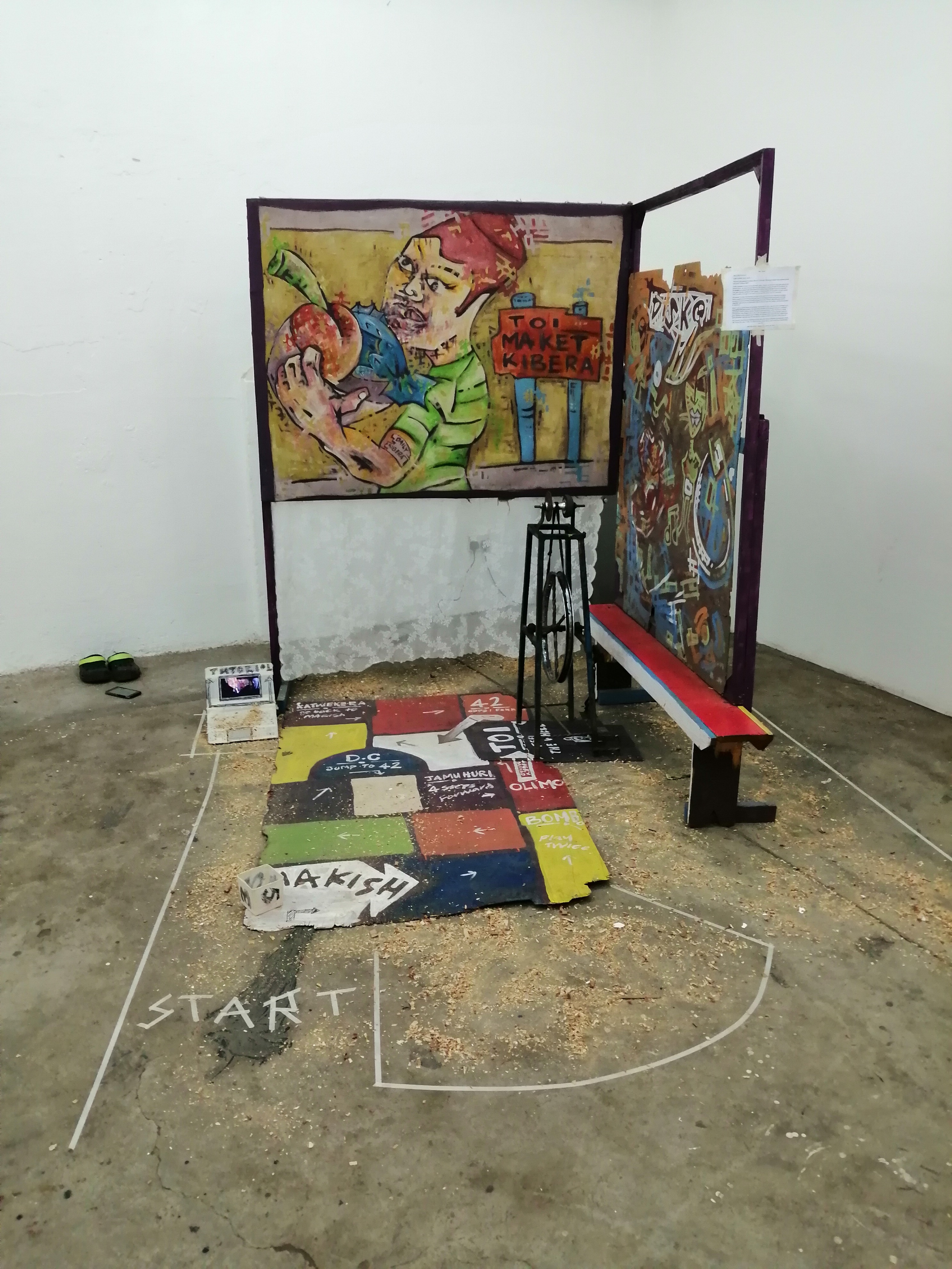 Maasai Mbili Artist Collective, also called M2, was founded in 2001 as a collective of Kenyan artists based in Kibera, Nairobi. In 2004, they moved from the streets of Kibera into their current studio. Their name means ‘Two Maasai’ in Kiswahili, which reflects their relation to Maasai culture and its values while linking it to the contemporary world. This reference mainly carries an ironic undertone, given that the Maasai are widely stereotyped in East Africa and also around the world. The collective’s practice, instead of tapping into such an idea of tradition, is deeply connected to its members’ experiences of life in the Kibera, the biggest urban slum on the African continent. The artists work across the mediums of drawing, performance, fashion, sound, and installation, and their interactive multimedia projects function as both studio and public platform. Rooted in community, the collective is committed to staying with social struggles and enhancing education, particularly in relation to disadvantaged communities and youth in Kibera. The current members of Maasai Mbili are Sharon Atieno, Otieno Gomba, Anita Kavochi, Otieno Kota, Joachim Kwaru, Xavier Makokha (Muliro), Vincent Masinde, Shivan Nafula, Fabian Sakwa, Kevo Stero, and Obi Vincent. Kevo Stero and Vincent Masinde are working in Bergen for this edition. Stero’s work draws on informal architecture, urban movement, and social ritual, with projects that travel between gallery and street to challenge the boundaries of ownership, authorship, and display. Masinde’s paintings consider the relationships between time, space, intimacy, and being away from the public eye.