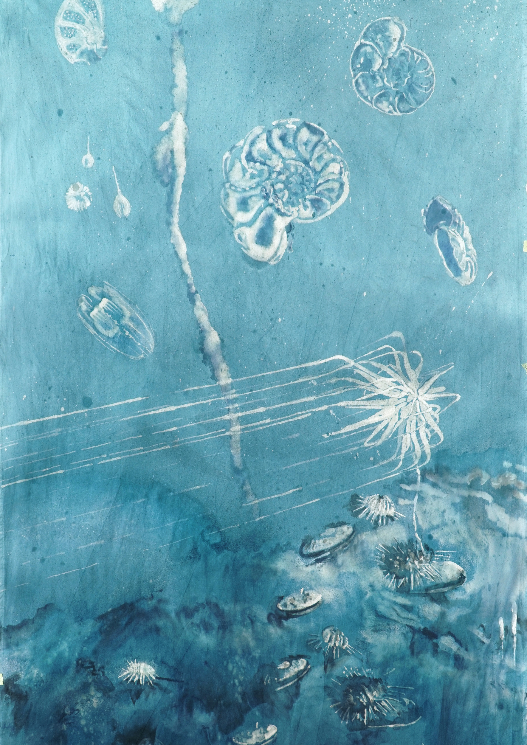Jäger’s installation comprises five large-scale textile panels inspired by the fjord’s vertical water layers, as well as sculptural watercolour book objects made from birch veneer and a printed notebook drawn from field sketches and notes. The Unseen — Fjord Conversations proposes new storylines and ways of encountering the fjord, not as a static landscape image but as a site of scientific investigation, industrial exploitation, and cultural imagination — as a complex living geobody that is subject to both natural and human-made processes of change.