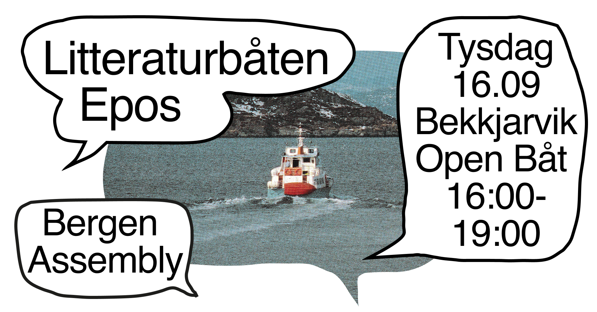 The Literature Boat Epos begins its journey along the coast and makes numerous stops that feature site-specific programmes. During its initial visit to Bekkjarvik, Epos invited everyone aboard the Open Boat between 14:00 and 19:00 to experience the artworks on board by Elsebet Rahlff, Elin Már Øyen Vister, and Philip Rizk, before it sails off once again.