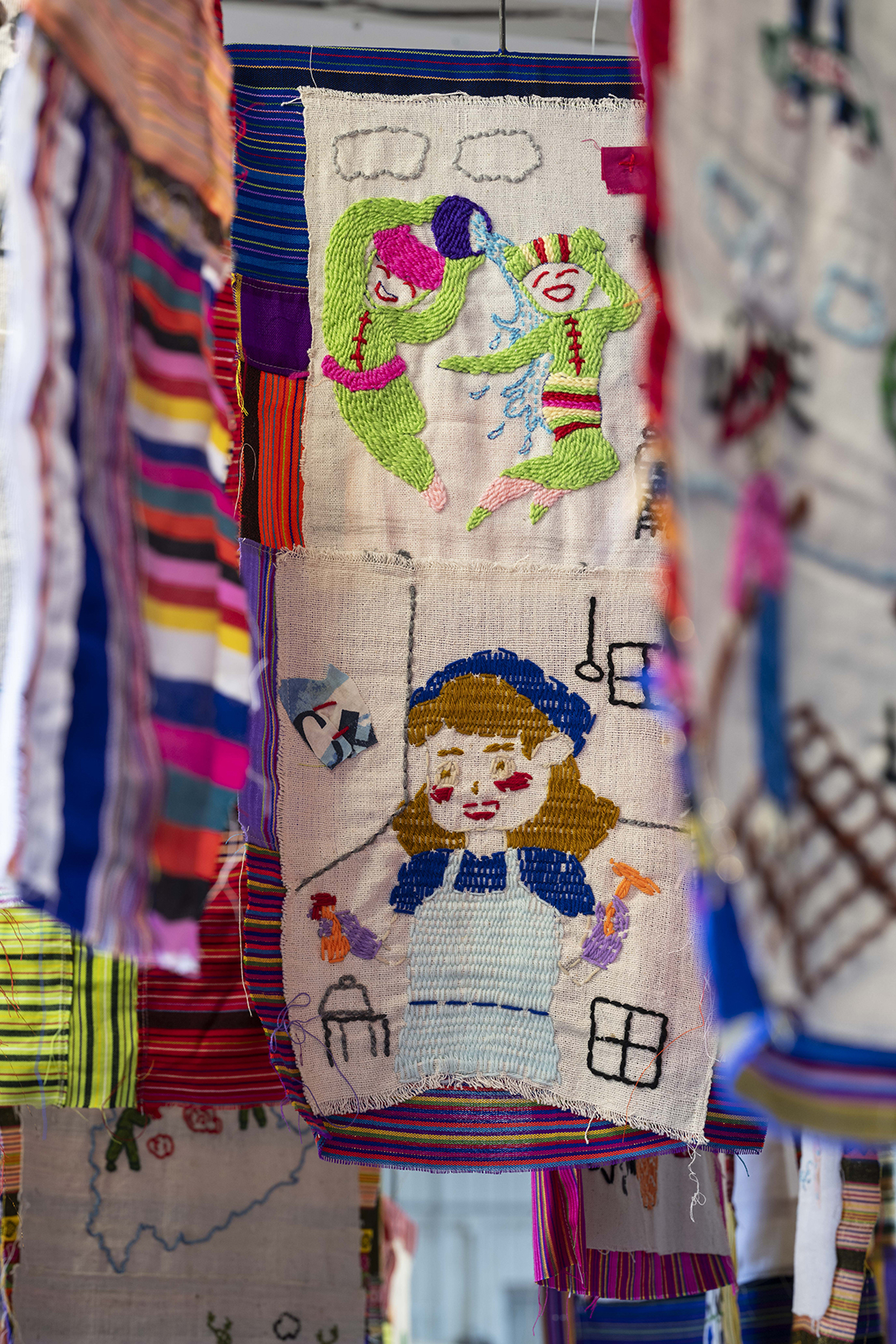 Jakkai Siributr’s project There’s no Place (2020–ongoing) began at a refugee camp at a border between Thailand and Myanmar where people from stateless Shan communities were invited to share their life experiences through embroidery. Siributr’s long-running textile project speaks to the impact of nation-states and colonialism on indigenous groups and comprises textile banners.